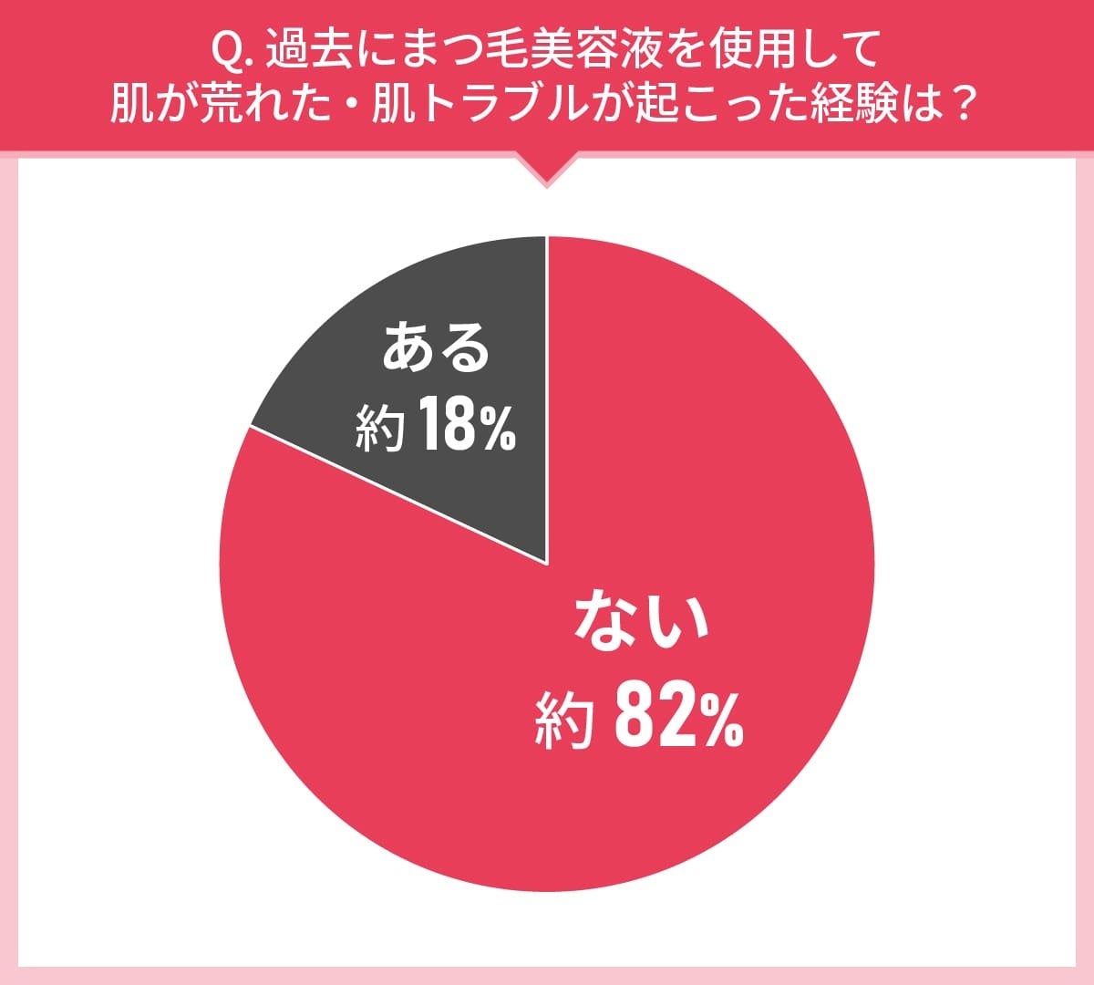 約82%の人が肌トラブルの経験はないと回答している一方で、約18%の人があると回答しました。少なからず合わないまつ毛美容液を使うと肌トラブルが起こる場合があるということですね。