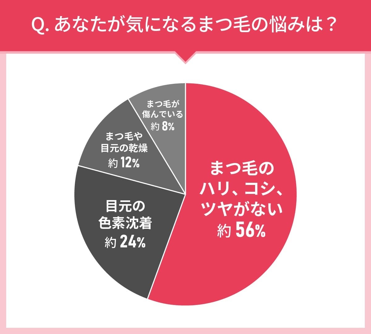 まつ毛や目元の悩みで最も多かったのは、「まつ毛のハリ、コシ、ツヤがない」の約56%で、過半数を占めていました。次いで、「目元の色素沈着」が約24%、「まつ毛や目元の乾燥」が約12%、「まつ毛が傷んでいる」が約8%と、まつ毛とあわせて目元の悩みを抱えている人も多いようです。まつ毛や目元の悩みは、まつ毛パーマやエクステとも関連がありそうですね。