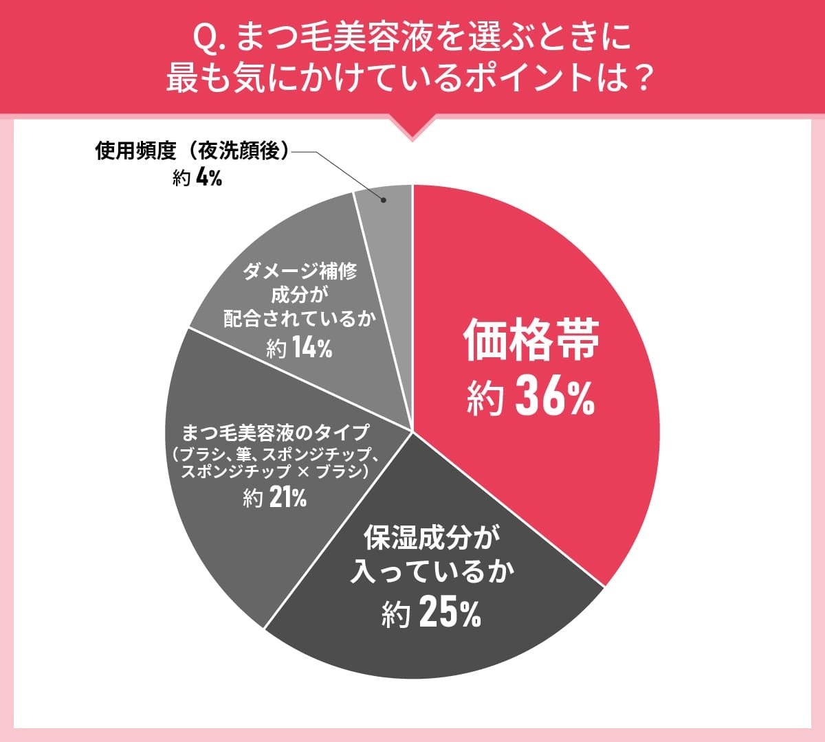 最も多かったのが「価格帯」の約36%でした。使用頻度とあわせ、続けやすい価格帯というのは重要なようです。次いで、「保湿成分が入っているか」が約25%、「ダメージ補修成分が配合されているか」が約14%と、まつ毛や目元の悩みに適しているかどうかという点も上位を占めました。