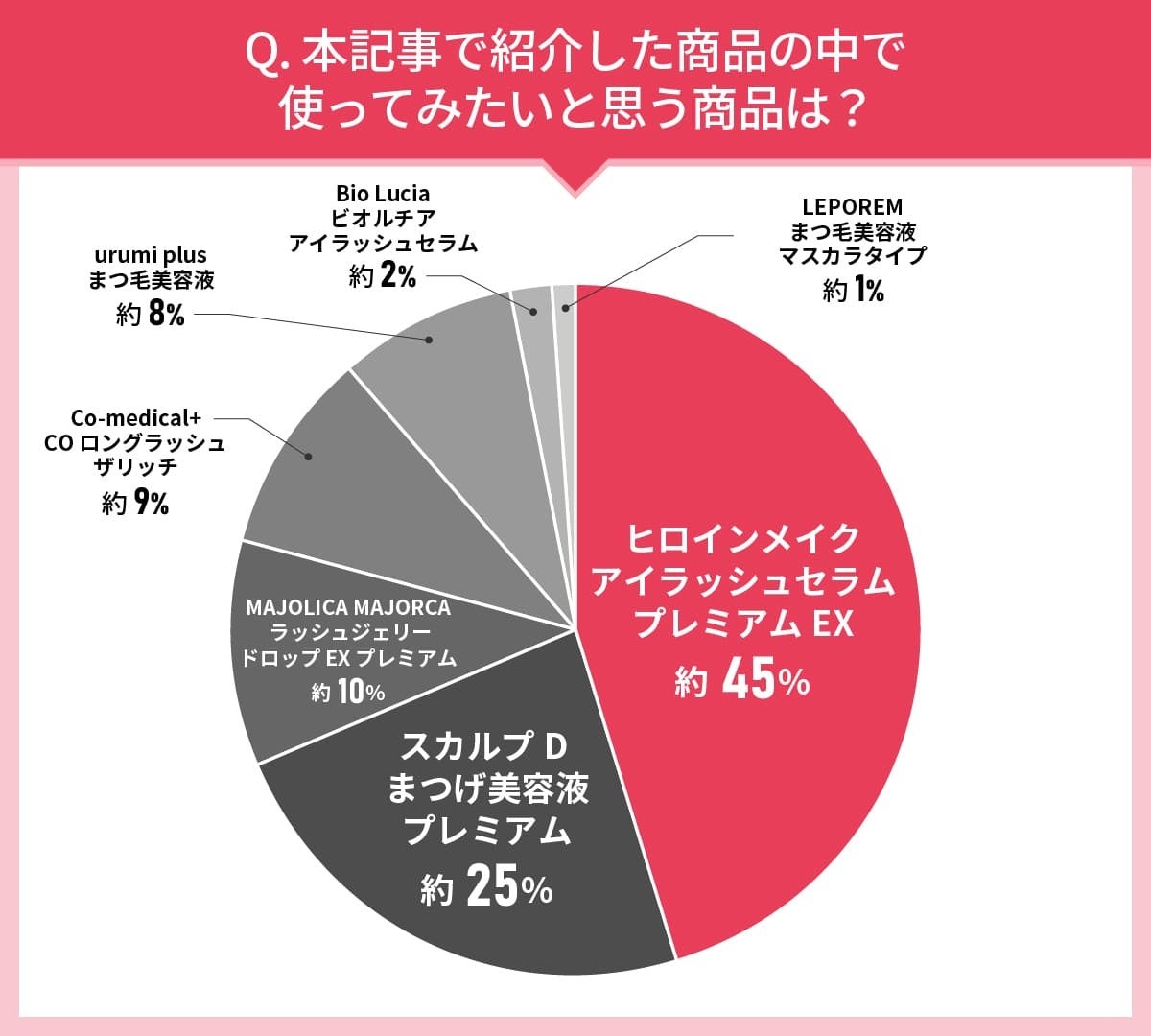 回答者にGranza Beautyの記事『まつげ美容液おすすめ10商品を美容家が厳選|チップや使用頻度による選び方解説』にある商品の中でどの商品を使ってみたいかを聞いてみました。ここでは『使ってみたいまつ毛美容液のTOP5』を紹介します。